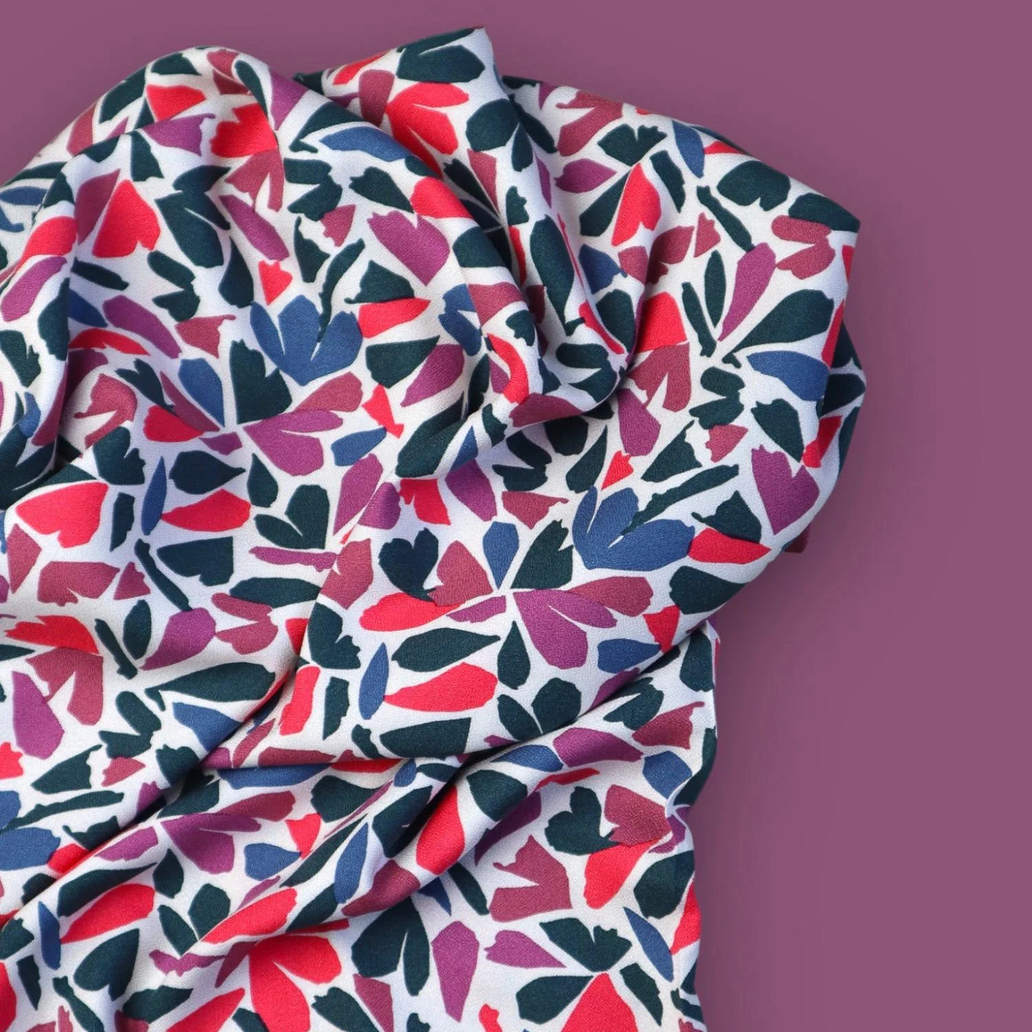 Különleges, kis méretű absztrakt virágos minta rózsaszín-kék-sötétzöld színben, puha tapintású viszkóz anyag.